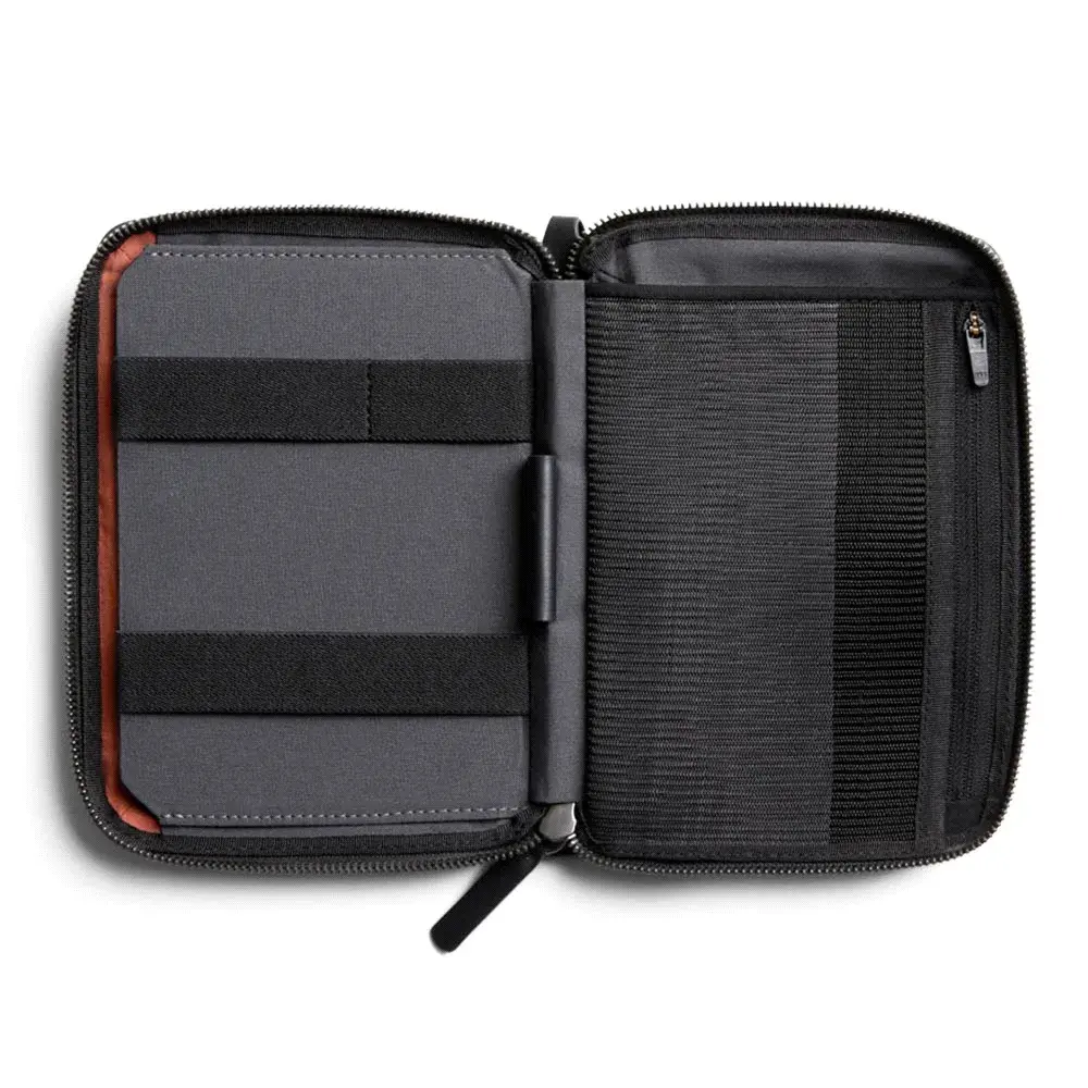 Full zip closure, Compresses down for in-bag carry, Elastic straps for cables and stationery, Large rear pocket for notebooks, passports or a power bank, Dual slip pockets for small items, Carabiner wrist strap included, Zipped internal and external pockets, Branded leather pen loop, Two attachment loops for adding a shoulder strap