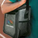 Elite cooler bag with thick PE foam insulation encased in a water-resistant PEVA inner liner. The outer construction is premium heather style poly-canvas with a large zippered front pocket and two mesh side pockets. Other features include a zippered top closure, smart zipper pulls, a woven carry handle and trendy elastic lacing which is ideal for holding a sweater or light jacket.