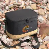Smart 6L cooler bag with PE foam insulation encased in a water-resistant PEVA inner liner. The outer construction is 600D polyester with a stylish natural cork accent panel around the base. It has a zippered top closure, a slip pocket on the front and an adjustable woven shoulder strap.