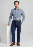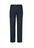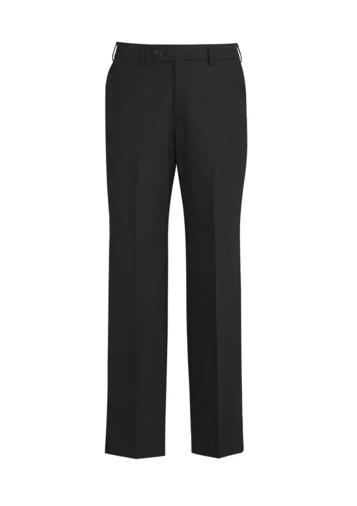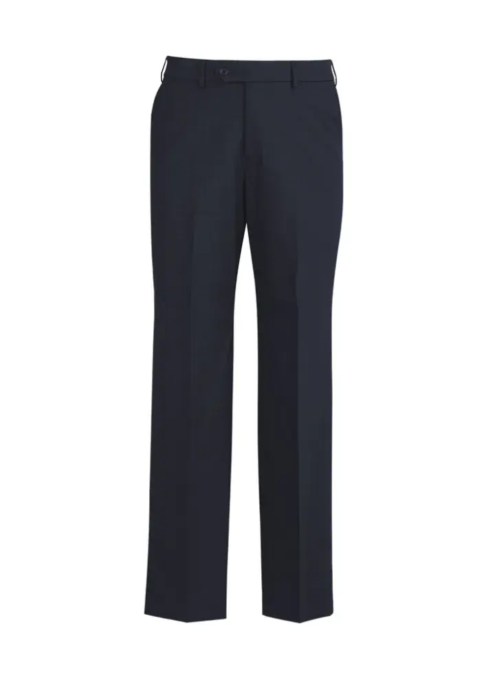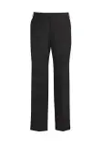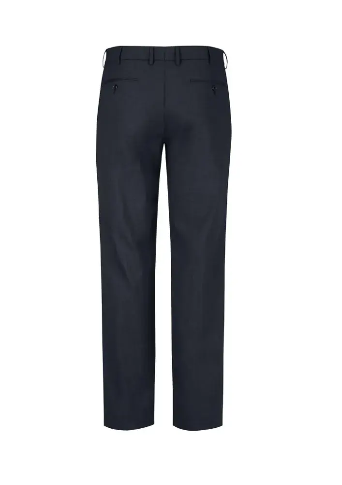 Flat front, straight through the leg. Waistband with stretch fusing. Internal security pocket on right front pocket, and two rear pockets.