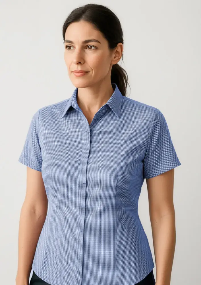 Cotton-rich fabric provides a soft hand feel, with the durability of polyester. Yarn dyed gingham check for a premium look, with added Elastane for comfort and stretch. Gentle machine wash and cool iron.