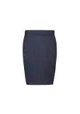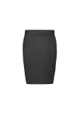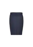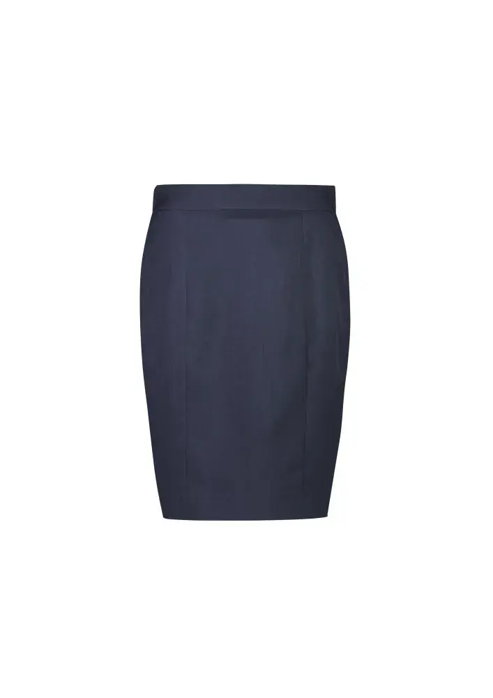 A modern Cool Stretch mid-waist pencil skirt with encased elastic on waistband sides.