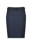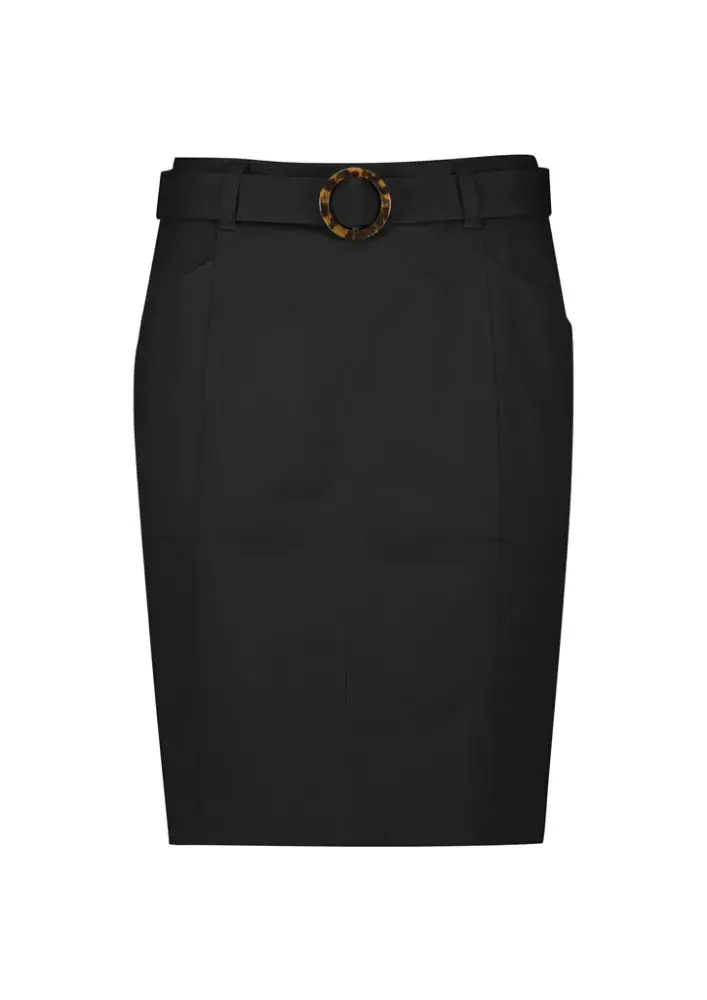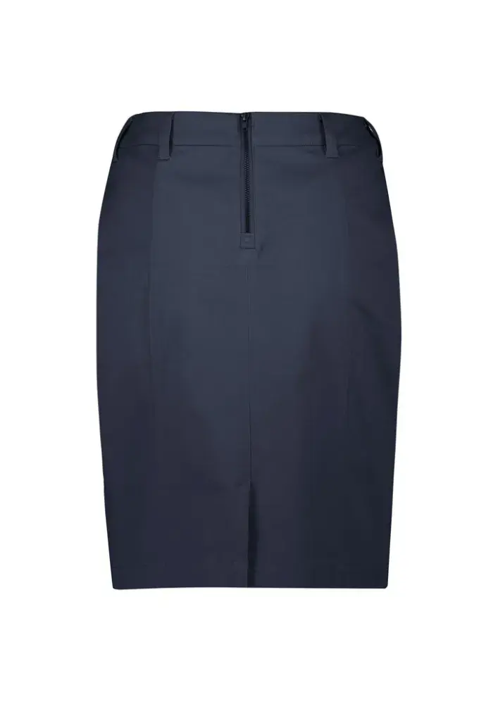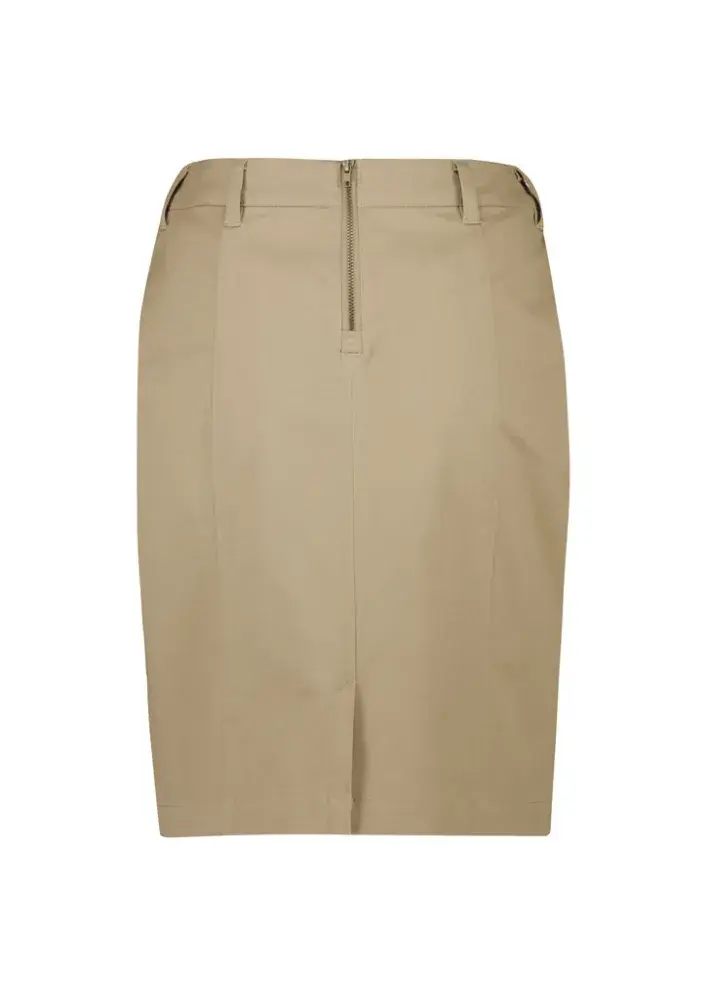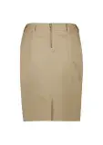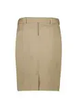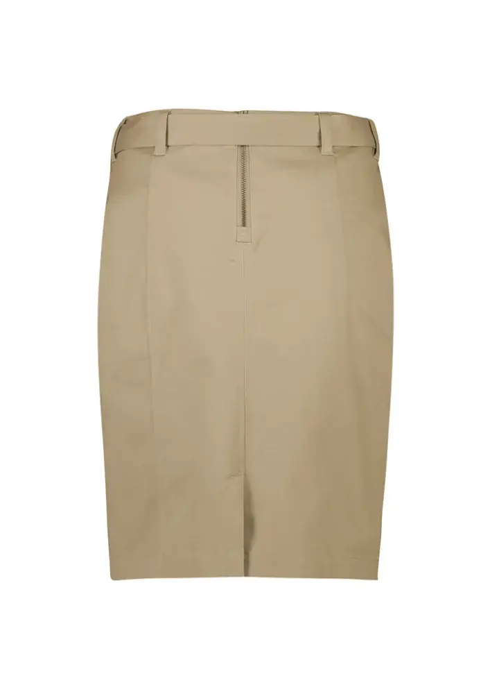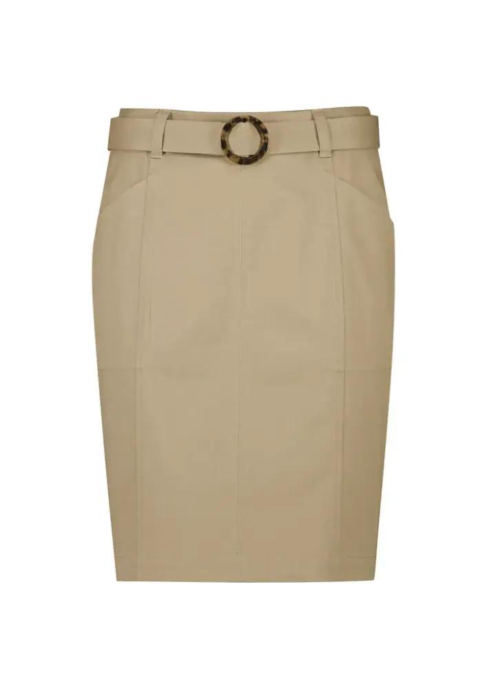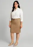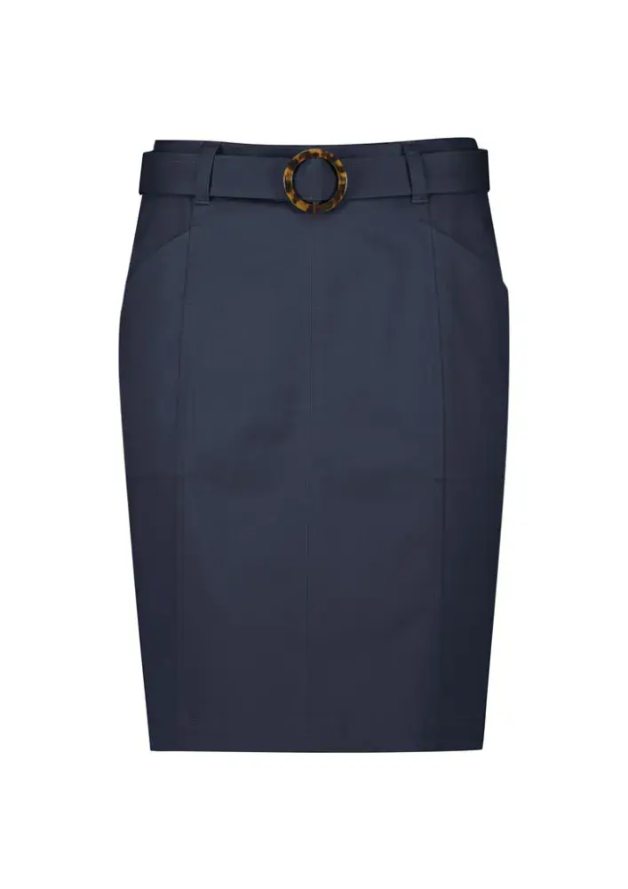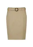 A modern Chino skirt featuring functional back split, non-gaping side seam pockets, metallic back zip feature, belt loops and modern trims. Pencil shape designed to finish mid length, but will vary depending on wearers height. Detachable belt included. Fabric has added stretch for comfort and easy movement