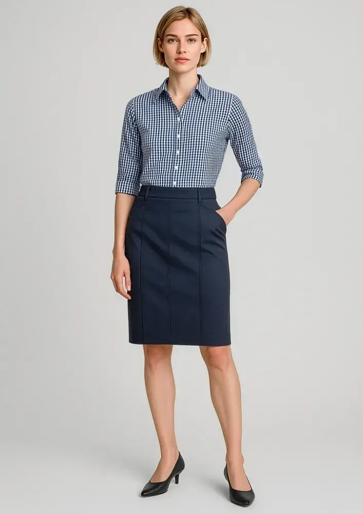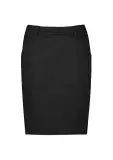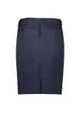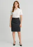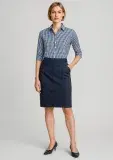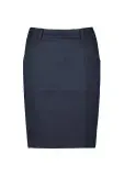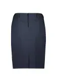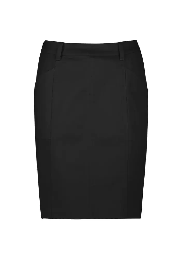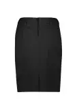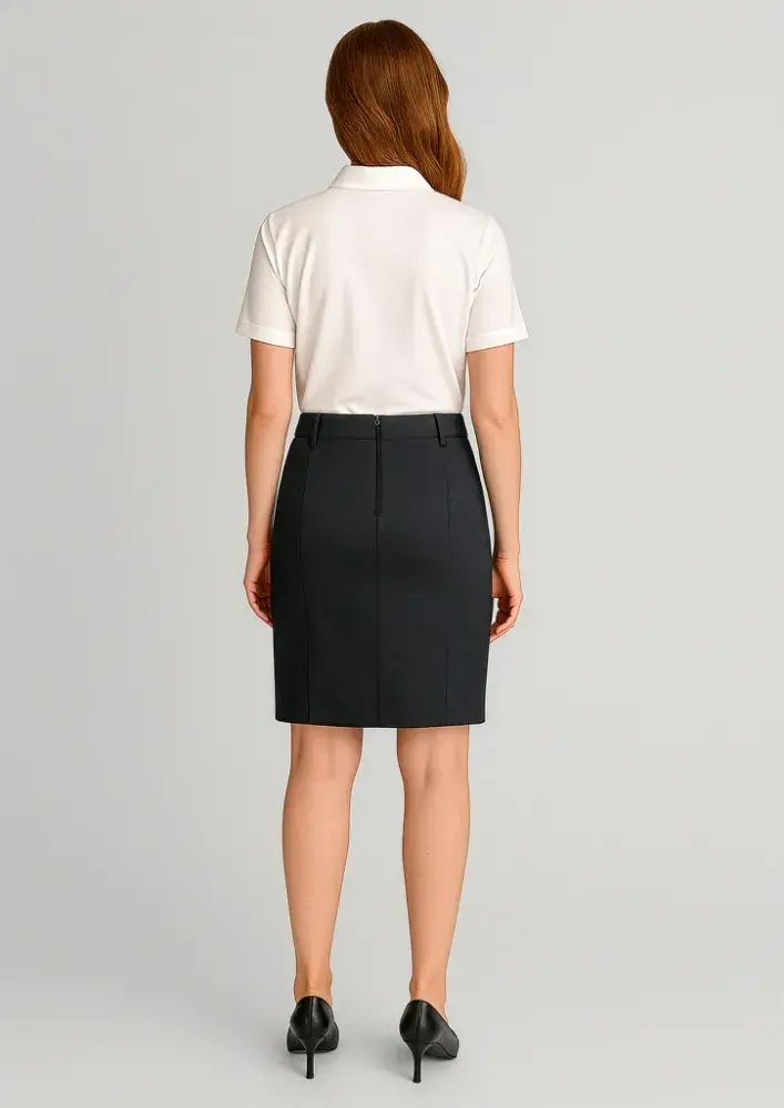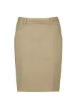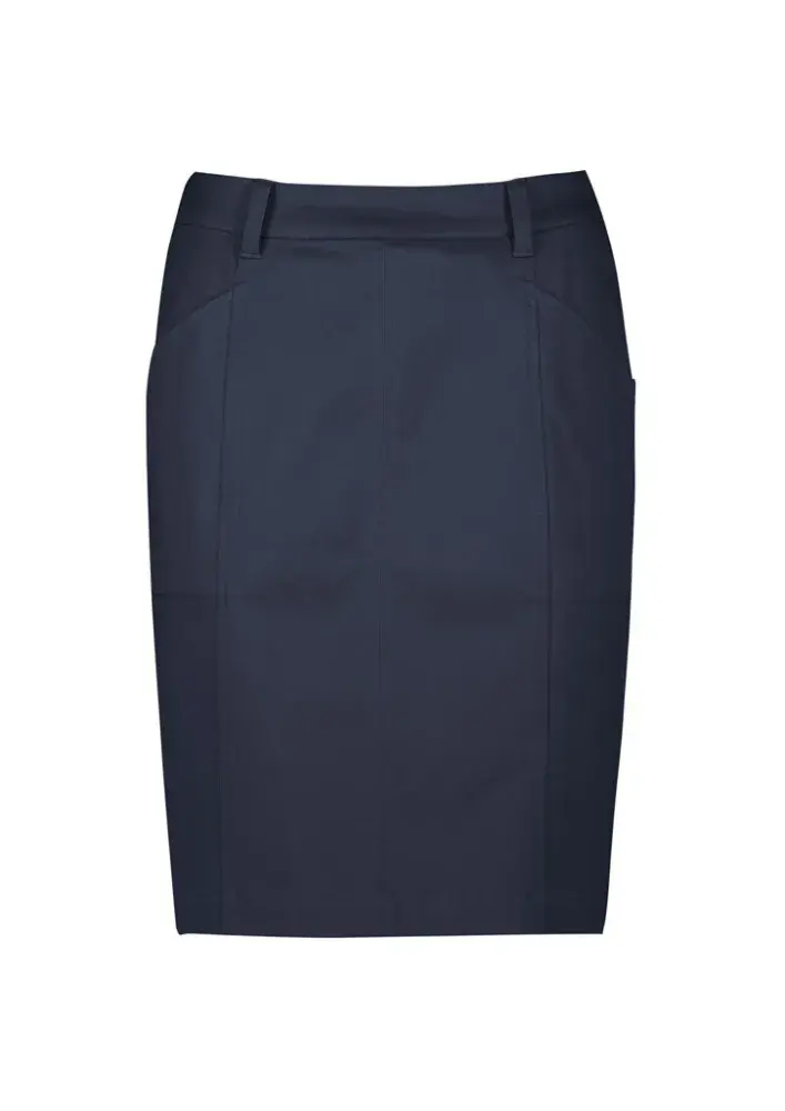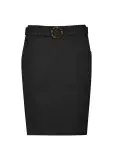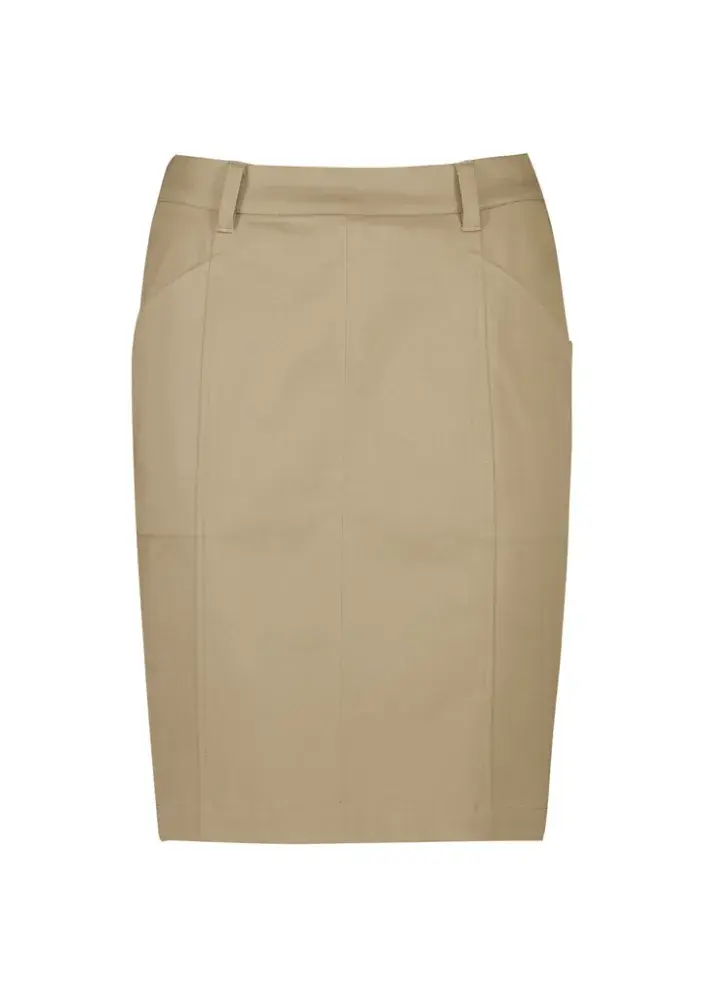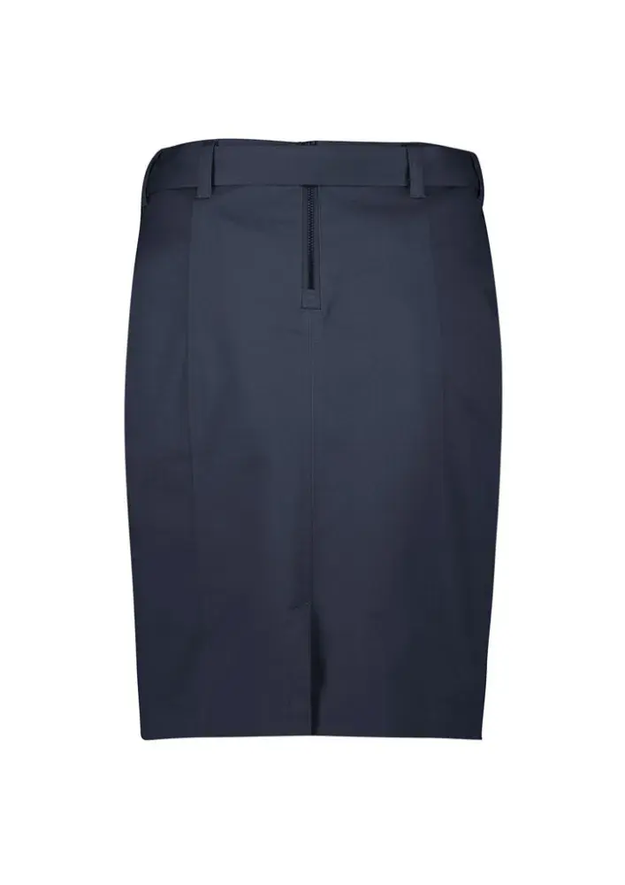 A modern Chino skirt featuring functional back split, non-gaping side seam pockets, metallic back zip feature, belt loops and modern trims. Pencil shape designed to finish mid length, but will vary depending on wearers height. Detachable belt included. Fabric has added stretch for comfort and easy movement