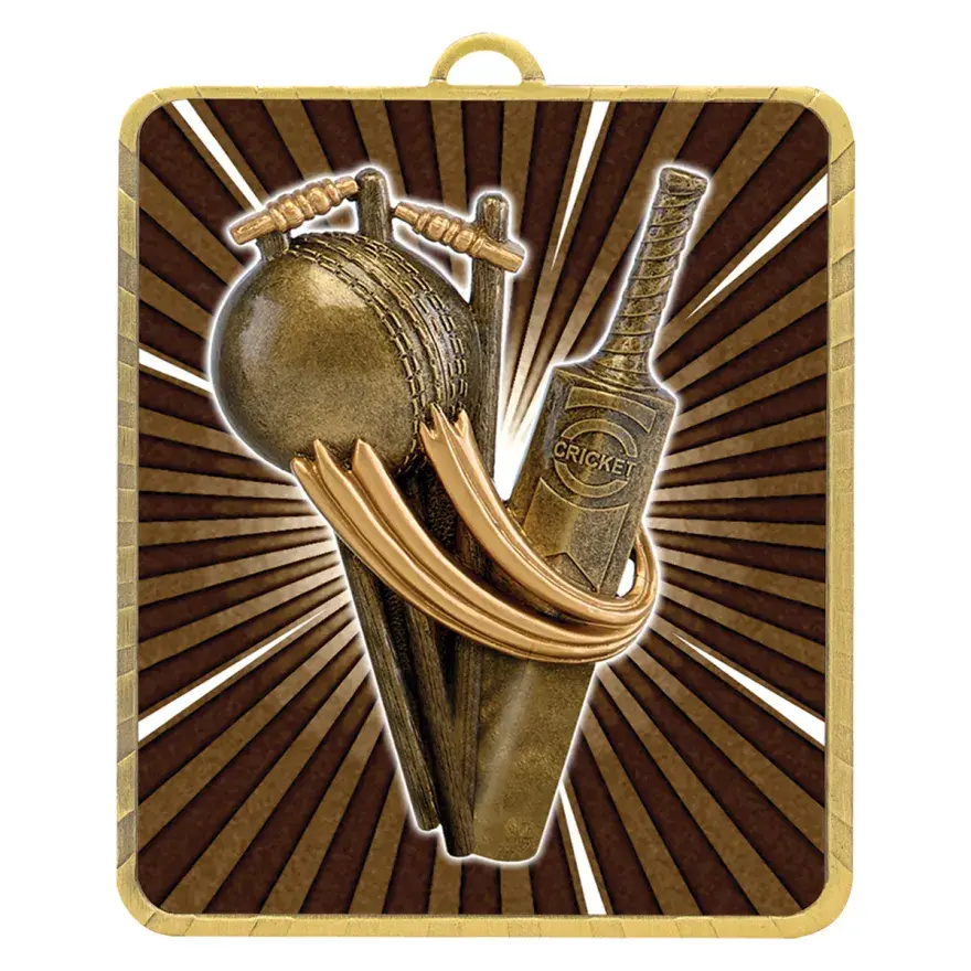 Antique gold, silver and bronze medals for Cricket. A classic design, the Sunraysia Medals feature classic elements - helmet, wickets, bat and ball. Medals feature an extra thick edge and a rectangle panel on the back of the medal for your engraving.