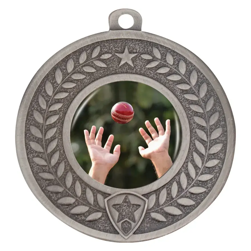 Classic antique medal featuring distinctive two-toned design. Medal a fantastic option for Cricket awards with interesting design. Ribbons available in all colours and medal boxes to suit.