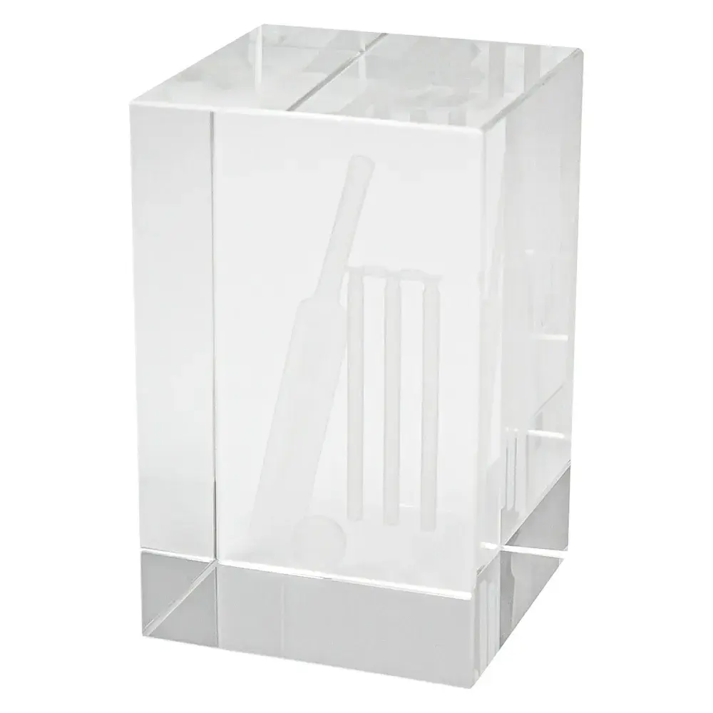 Hologram award for cricket features 3D theme design with bat, ball and stump elements. A trusted option for various cricket events and presentations, a prestige crystal block supplied in a presentation gift box.