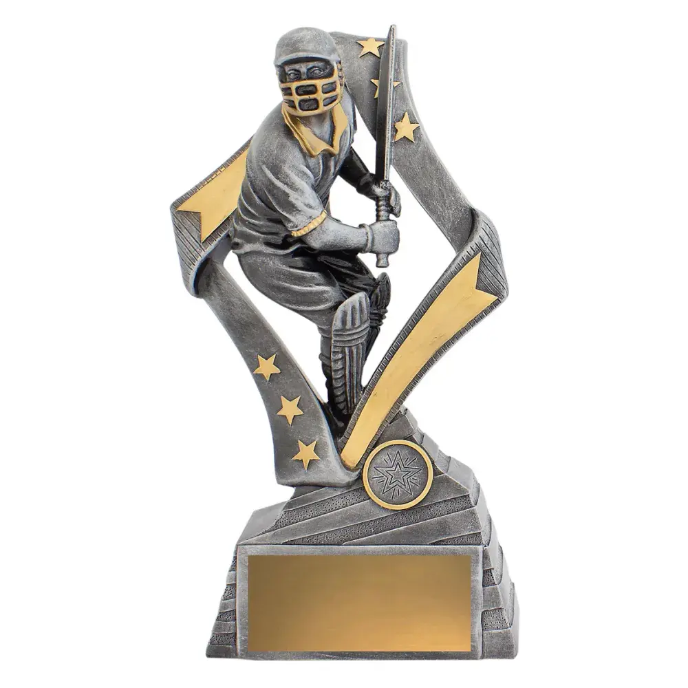 Inspiring design for your cricket trophies, Flag series features batsman in action and complete with classic antique silver colours. Substantial trophy with space for customisation if needed.