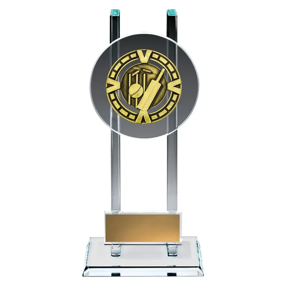 Bold glass awards are perfectly suited to recognise the top achievements at your team or club. Elevated glass platform showcases a brilliant metal theme for your sport or activity - space for your engraving as well.