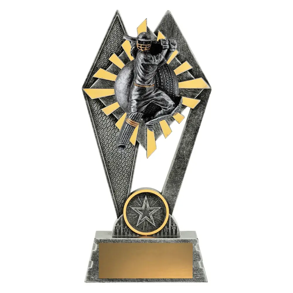 The Peak Series - for Cricket - is an innovative trophy series offering super value for such an impressive size range. An elevated design that showcases a female batsman theme against a vibrant sunray style background.