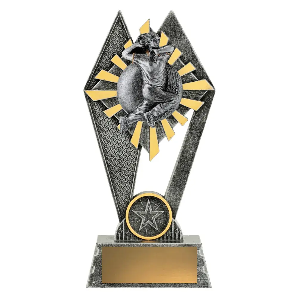 The Peak Series - for Cricket - is an innovative trophy series offering super value for such an impressive size range. An elevated design that showcases a female bowler theme against a vibrant sunray style background.