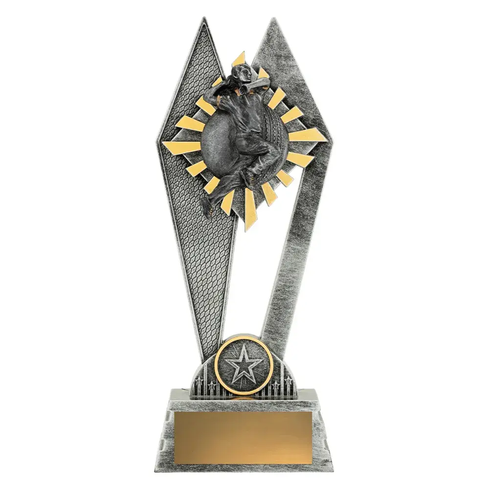 The Peak Series - for Cricket - is an innovative trophy series offering super value for such an impressive size range. An elevated design that showcases a male bowler theme against a vibrant sunray style background.