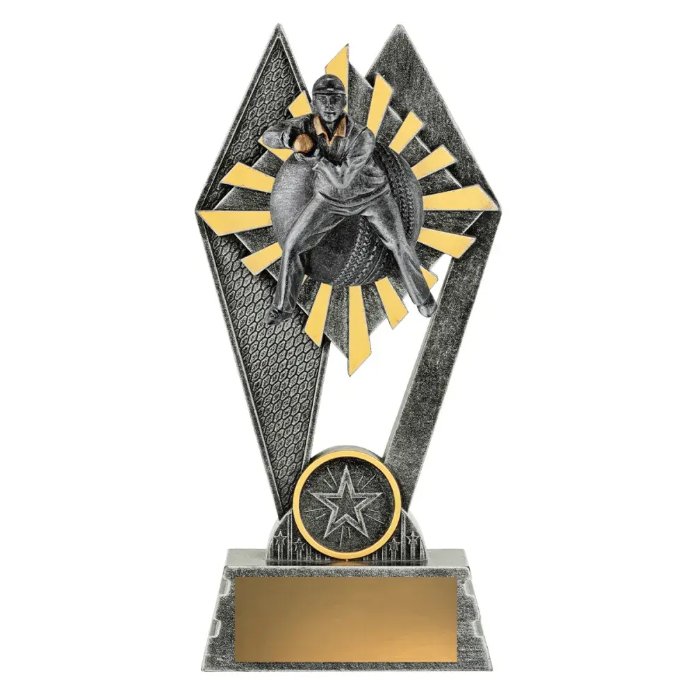 The Peak Series - for Cricket - is an innovative trophy series offering super value for such an impressive size range. An elevated design that showcases a male fielder theme against a vibrant sunray style background.