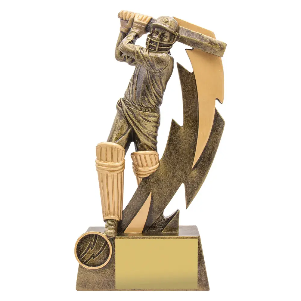 Cricket Shazam Batsman series showcases the driving batsman with excellent detail. Cricket trophies completed in classic trophy gold colours and available in 4 sizes. There is the option if required of including your logo. Bowler, batsman and fielder versions in the series - male and female versions and sizes.