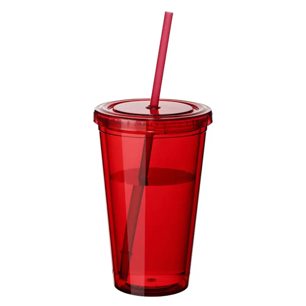 A 473ml high quality double wall AS plastic tumbler strong and durable leak tight screw on lid with a long soft plastic straw which has a stopper avoiding falling out BPA free it is not dishwashing safe and handwashing is recommended.
