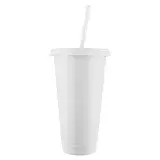 680ml high quality single wall PP plastic solid coloured tumbler. Strong durable and leak tight screw-on lid with a long plastic straw which has a stopper to avoid falling out. BPA free and handwashing is recommended.