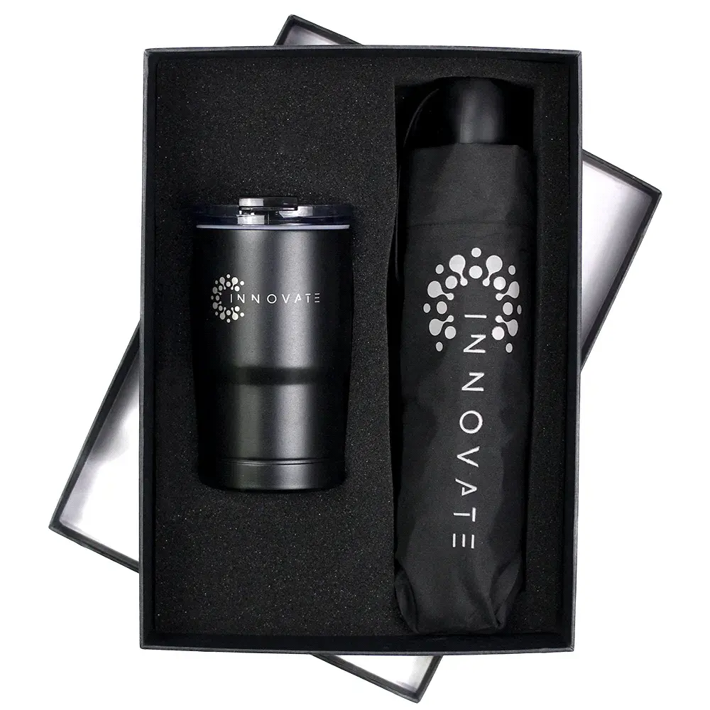 Elevate your corporate gifting with this premium set featuring two of our most-loved essentials. The 21" Recycled Tipless Umbrella keeps you dry in style, while the versatile two-in-one Bluff Tumbler ensures you stay refreshed on the go. Thoughtfully paired and beautifully presented, this set makes a standout impression for clients, teams, and events.