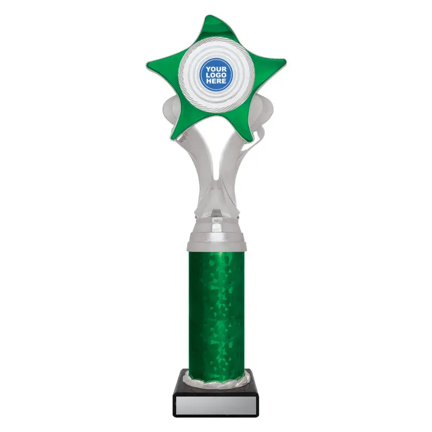 Cosmic series of affordable trophies feature star spangled holder in gold or silver - choose colour of column to suit your order. Suit 25 or 50mm centre insert.