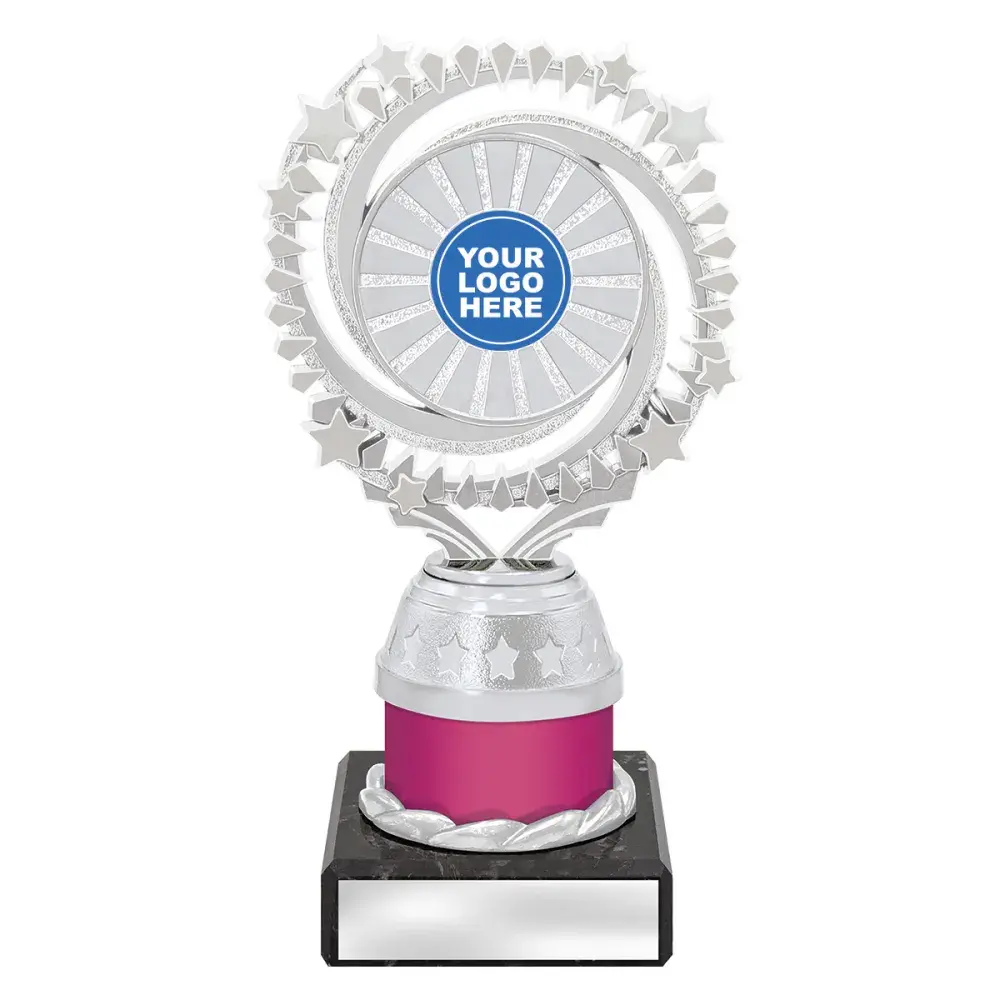 Cosmic series of affordable trophies feature star spangled holder in gold or silver - choose colour of column to suit your order. Suit 25 or 50mm centre insert.