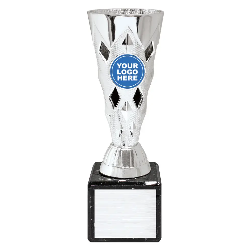 Fantastic cups with diamond inspired design finished in classic silver present a central position for your custom logo.