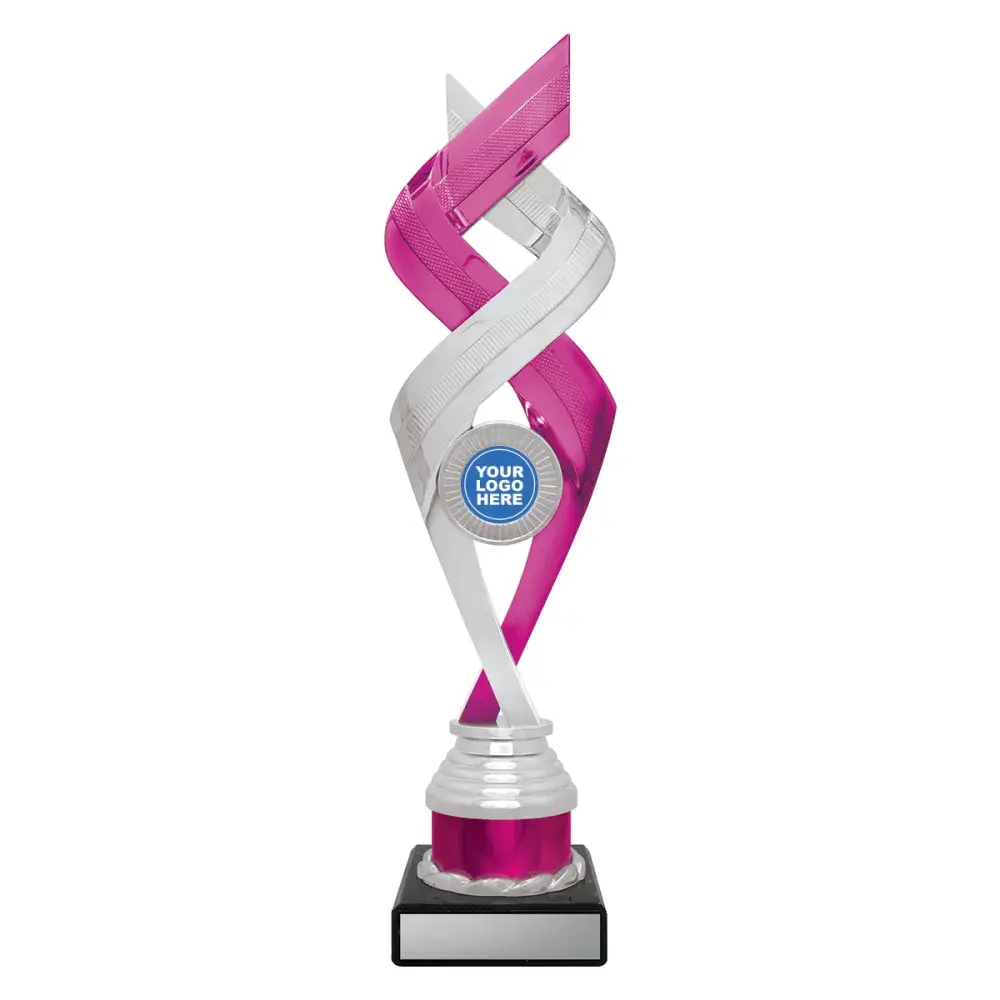 Stylish Jetstream series of holder trophies feature a complex design of intertwining elements and a central spot for your custom logo. Available in different colours.