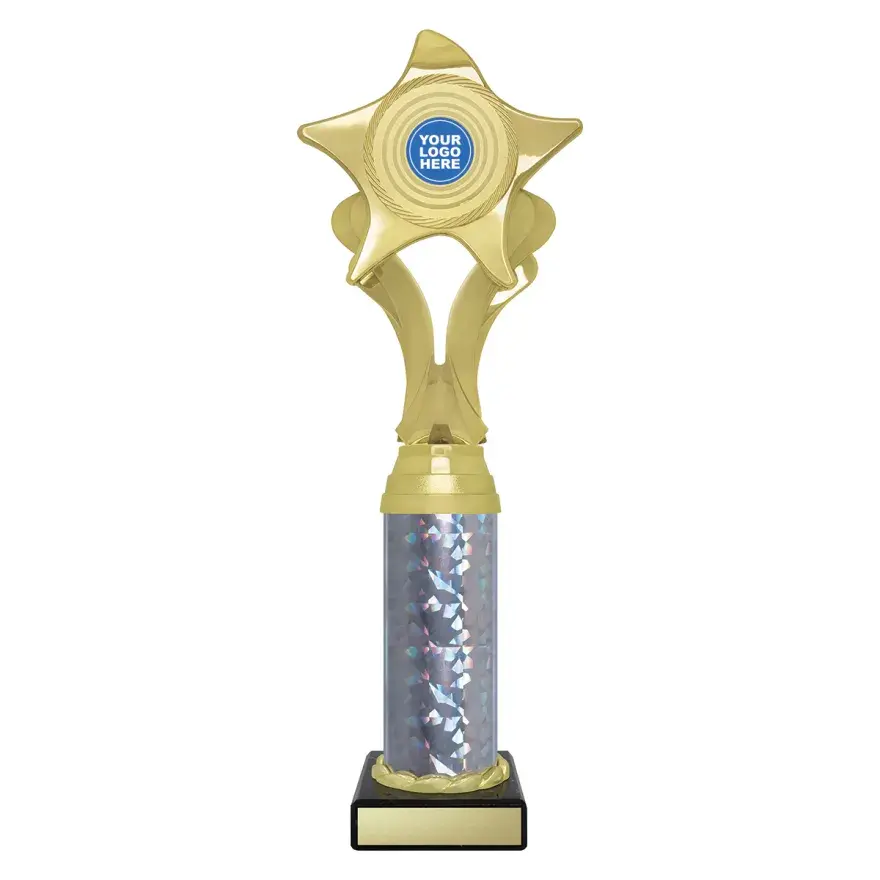 Peak style trophies - for Ballet - offer fantastic value for bigger series of trophies available in 3 sizes. Design showcases key elements for Ballet against vibrant sunray background. Trophies finished in classic antique silver and gold highlights.