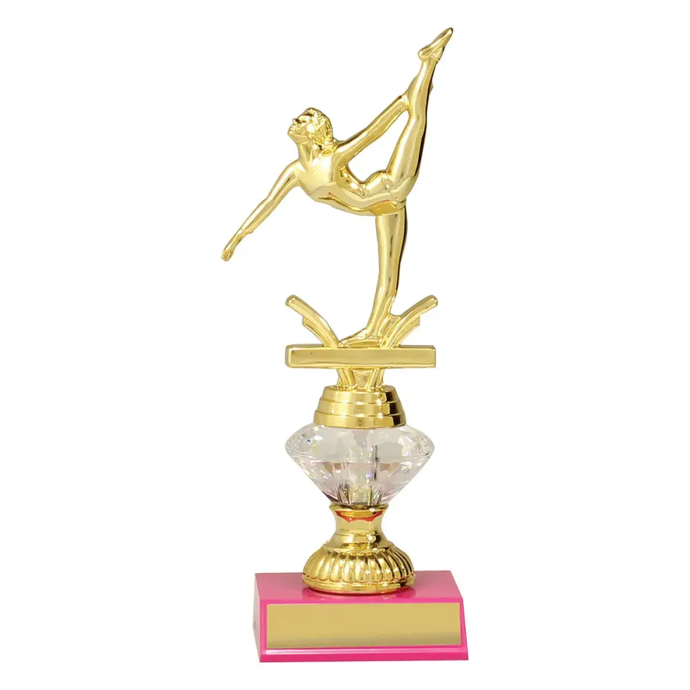 Stylish 'diamond' trophies ideal for dance and performing arts. With pink base and diamond riser, trophies are finished with bright gold dance figure.
