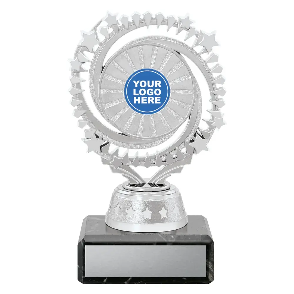 Swirling silver holder with multi star elements to showcase your custom logo over number of sizes.