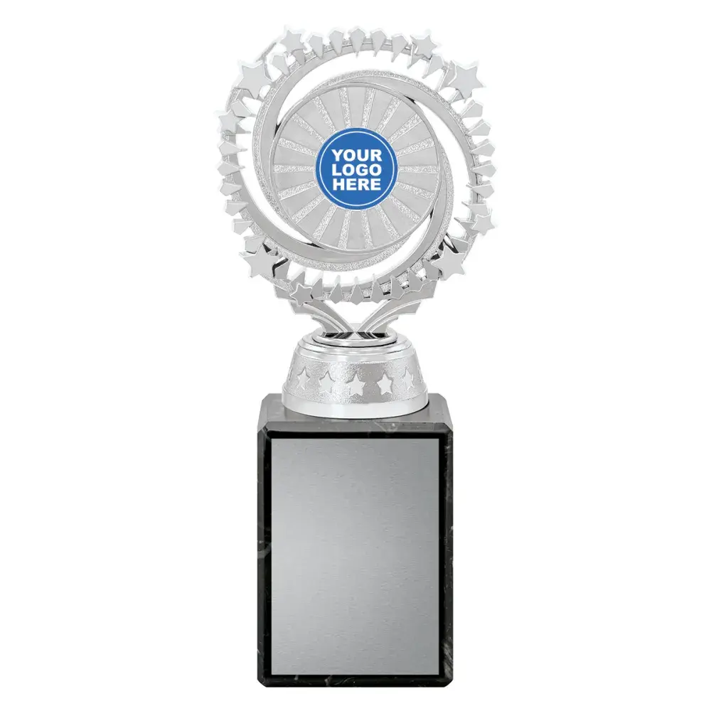 Swirling silver holder with multi star elements to showcase your custom logo over number of sizes.