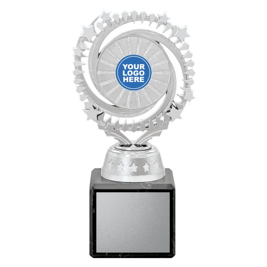 Exciting design of acrylic trophy showcases the gold theme for your sport or trophy. An affordable award with terrific space for your engraving.
