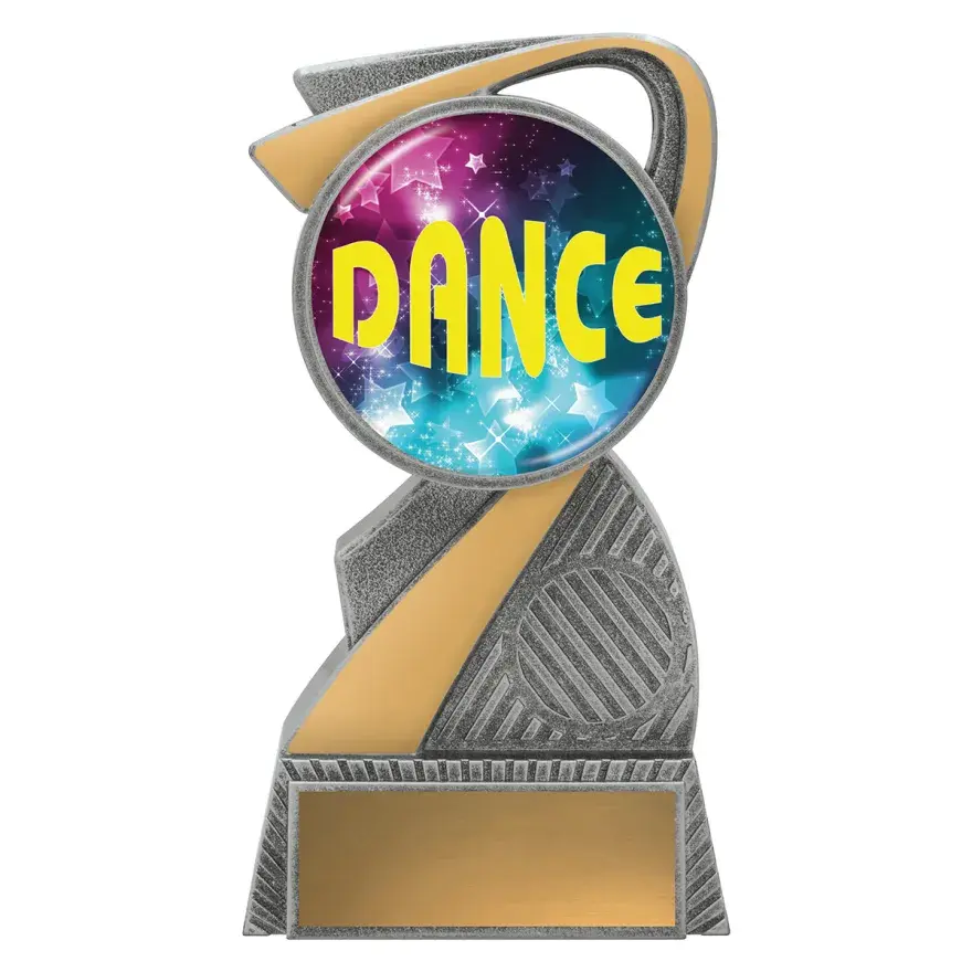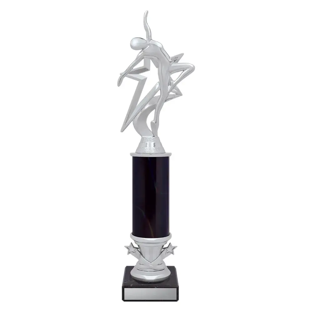 Outstanding series of dance trophies feature star riser component and brilliant abstract dance top in shiny silver. Change colour of column to suit your awards.