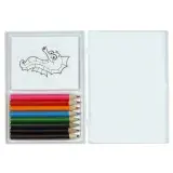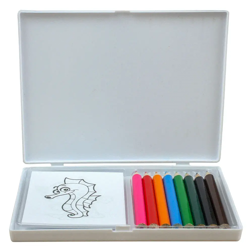 A fun, compact colouring pad featuring animals, complete with 8 vibrant pencils, all neatly packed in a white plastic case - perfect for creativity anytime, anywhere.