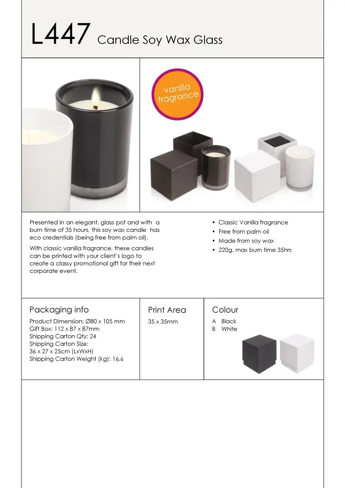 Presented in an elegant glass pot, this soy wax candle has eco credentials (being free from palm oil). With classic vanilla fragrance, these candles can be printed with your client's logo to create a classy promotional gift for their next corporate event.