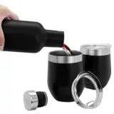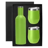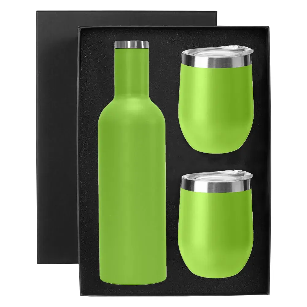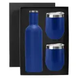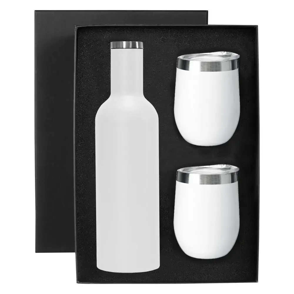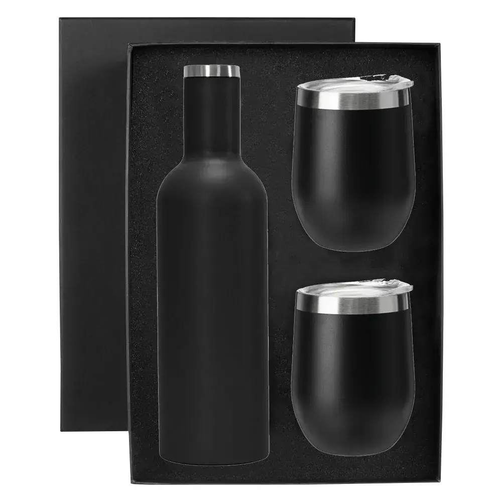 A great BPA free vacuum insulated double wall 730ml stainless steel Shiraz Drink Bottle in a unique wine bottle design makes the best addition to any picnic or party and 2 x 350ml (two standard glasses of wine) 304 grade stainless steel egg shape wine and coffee cup with a BPA free push-seal plastic lid. Powder coated matt finishing exterior and electrolysis interior all packed into a smooth semi-gloss black cardboard box with a die-cut foam base to hold bottle and mugs.