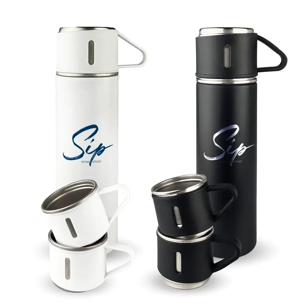 Double walled vacuum insulated technology keeps beverages hot for up to 12 hours or cold for up to 24 hours. Made of 304 stainless steel inner coating for better temperature retention. A unique matt finishing 500ml flask that makes pouring completely hassle-free spill-free and rust-proof. A push button operation with no condensation on the outer body even while carrying icy cold water completely sweat-free. Leak proof design. Contains no toxins. Completely BPA and phthalate-free. Three small cups made of stainless steel with plastic handle and outer. All packed into a smooth semi-gloss black cardboard box with a die-cut foam base to hold bottle and mugs. Not dishwasher safe handwashing is recommended.