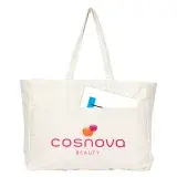 A trendy 12oz 100% cotton canvas shopper with short shoulder handles features a small zipped pouch inside and a large flip pocket in front.