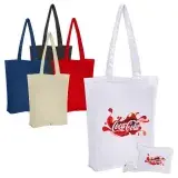 Environmental friendly calico bag with long handles so it can be carried on shoulder it is made of 170gsm cotton and can be folded and zipped into a small wallet size.