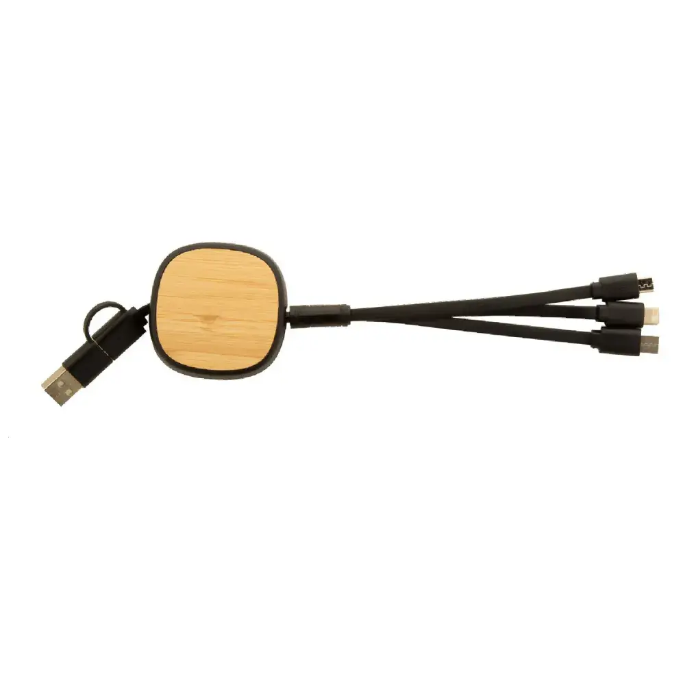 Telescopic charging cable with bamboo and recycled ABS design | Connectors: Micro USB, USB-C, Lightning | Inputs: USB and USB-C | Compact and portable design | Eco-conscious materials for sustainability | Ideal for branding, offices, travel, or promotional campaigns