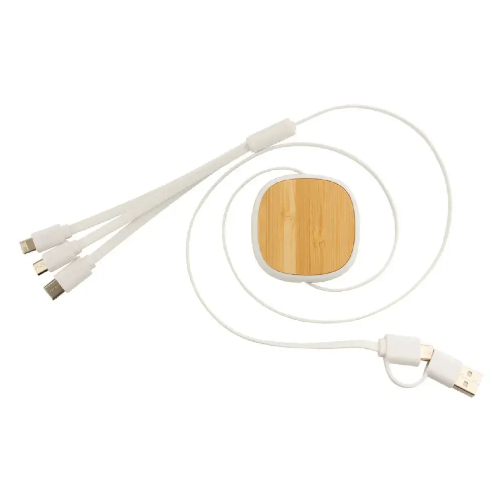 Telescopic charging cable with bamboo and recycled ABS design | Connectors: Micro USB, USB-C, Lightning | Inputs: USB and USB-C | Compact and portable design | Eco-conscious materials for sustainability | Ideal for branding, offices, travel, or promotional campaigns