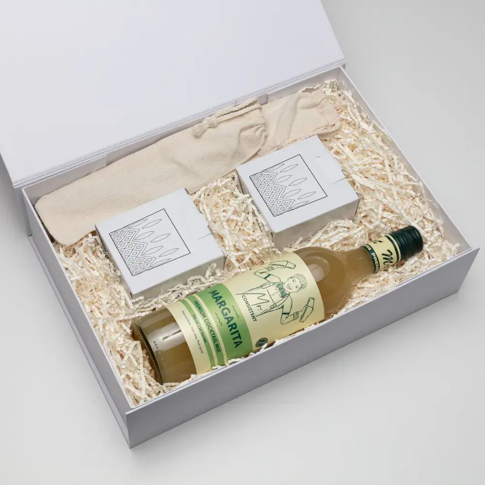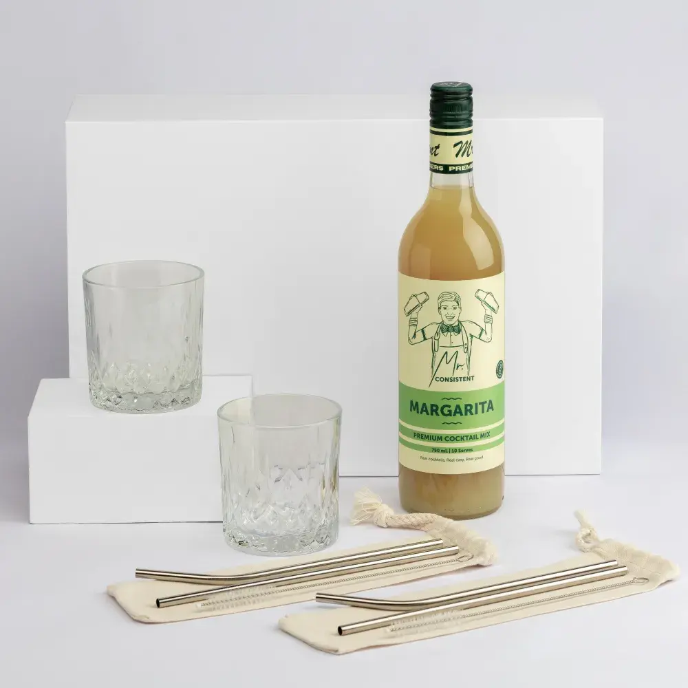 A bottle, a clink, and a ready-made good time. Lift open the lid and you’re halfway to cocktail hour. With a premium Mr. Consistent Margarita Mix, cut-glass tumblers, and sleek metal straws in their own canvas pouches, The Happy Hour brings laid-back luxe to your gift list. Whether it’s a Friday team drop, a client thank-you, or a staff celebration – this one always gets the cheers. It’s fun, fresh, and a little bit fancy (in all the right ways). What’s Inside. 1 × Mr. Consistent Margarita Mix (serves 10) – fresh, zesty, and bartender-approved. 2 × Cut-glass tumblers – classic and weighty in hand. 2 × Mojito straw sets – includes 2 × stainless steel straws + cleaning brush in a calico reusable pouch. Presented in a white magnetic-close gift box with soft shred.