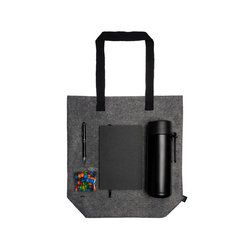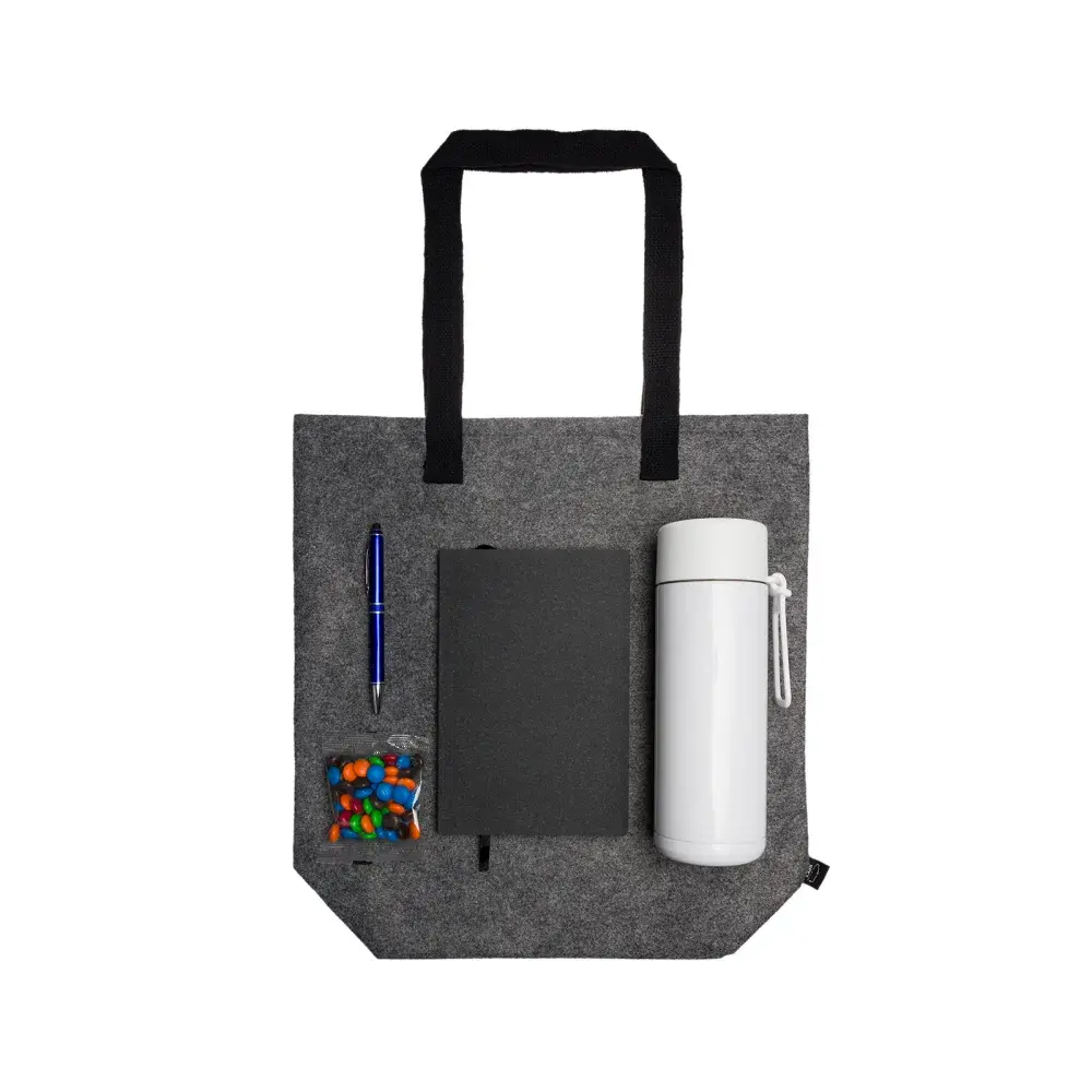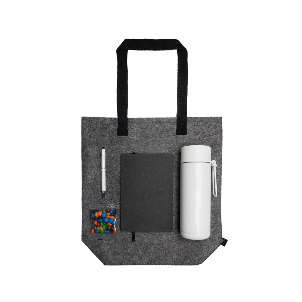 Tote Bag: Grey/Black Tote Bag;Notebook: Grey Notebook;Pen: White Pen, Blue Pen, Black Pen;Bottle: White Bottle, Black Bottle;M&M's: Clear/Assorted M&M's