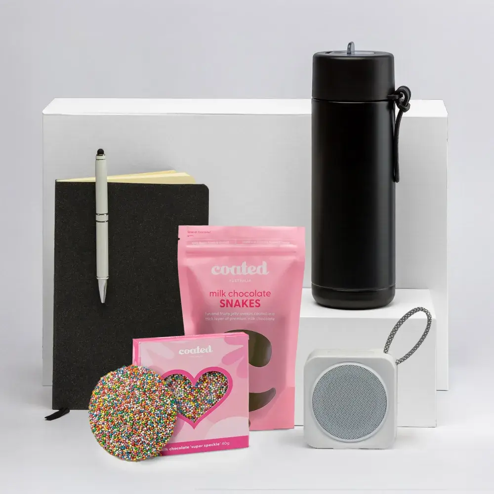 WFH just got a glow-up (with snacks included). Whether they’re kitchen-table hustling or couch-CEOing, this kit has everything they need to look the part and stay in the zone. A sleek desk bottle. A recycled leather notebook for next-big-idea scribbles. A mini speaker for background beats. And the kind of pen that mysteriously disappears because everyone wants one. And because every good workday deserves a little treat, this set also includes two indulgent chocolates made in Victoria — playful, premium, and guaranteed to brighten the mid-afternoon slump. The Sweet Setup is perfect for onboarding, client gifting, remote teams, or just reminding someone they’ve absolutely got this – wherever they log in from. What’s Inside? 1 × Astro Soft Cover Recycled Leather Notebook – A5 size, with document holder and 160 lined pages. 1 × Columbia Aluminium Pen – twist-action, with built-in stylus; available in black, white, or blue. 1 × Pep Mini Bluetooth Speaker – 5W, soft-touch finish with carry loop and charging cable. 1 × Zara 600ml Stainless Steel Vacuum Bottle – with sip lid, straw and silicone carry strap; black or white. 1 × Coated Milk Chocolate Snakes (200g) – mixed party snakes coated in premium milk chocolate, handcrafted in Victoria (yes, even the green ones). 1 × Super Speckle – Heart Box (40g) – an oversized milk chocolate speckle topped with crunchy hundreds and thousands, made in VIC and packed in a colourful heart-cutout gift box. Presented in a white magnetic-close gift box with vanilla cream shred.