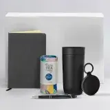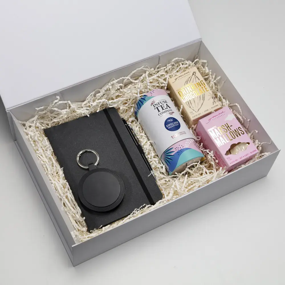 Thoughtful, elevated, and ready to impress from the very first moment. The Ultimate Welcome is designed to make new beginnings feel seamless — whether it’s onboarding a new team member, welcoming a client, or setting the tone for a premium program. Inside the crisp magnetic box is a curated selection of everyday essentials: a double‑walled stainless steel coffee cup for on‑the‑go days, a recycled leather notebook and premium aluminium pen for ideas worth keeping, and an eco-conscious charging kit for staying connected anywhere. For a calmer ritual, this edition includes a tube of full‑bodied English Breakfast tea — rich, warm, and perfectly balanced. It’s practical, polished, and quietly luxurious. What’s Inside? 1 × Stainless steel vacuum coffee cup (360ml) – double walled, drink-from-anywhere push‑button lid, BPA free. 1 × A5 recycled leather notebook – hard cover, 160 lined pages, ribbon marker, elastic strap & pen loop. 1 × Aluminium stylus pen – gloss finish, chrome detailing, long‑life black refill. 1 × Recycled ABS cable set – compact circular case with magnetic lid & multi-adapters (Type C, Type A, Micro USB, iOS). 1 × English Breakfast tea pouches (16-pack) – rich Sri Lankan flavour, full‑bodied & beautifully balanced. Presented in a white magnetic‑closure gift box with custom digital sleeve.