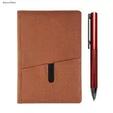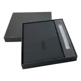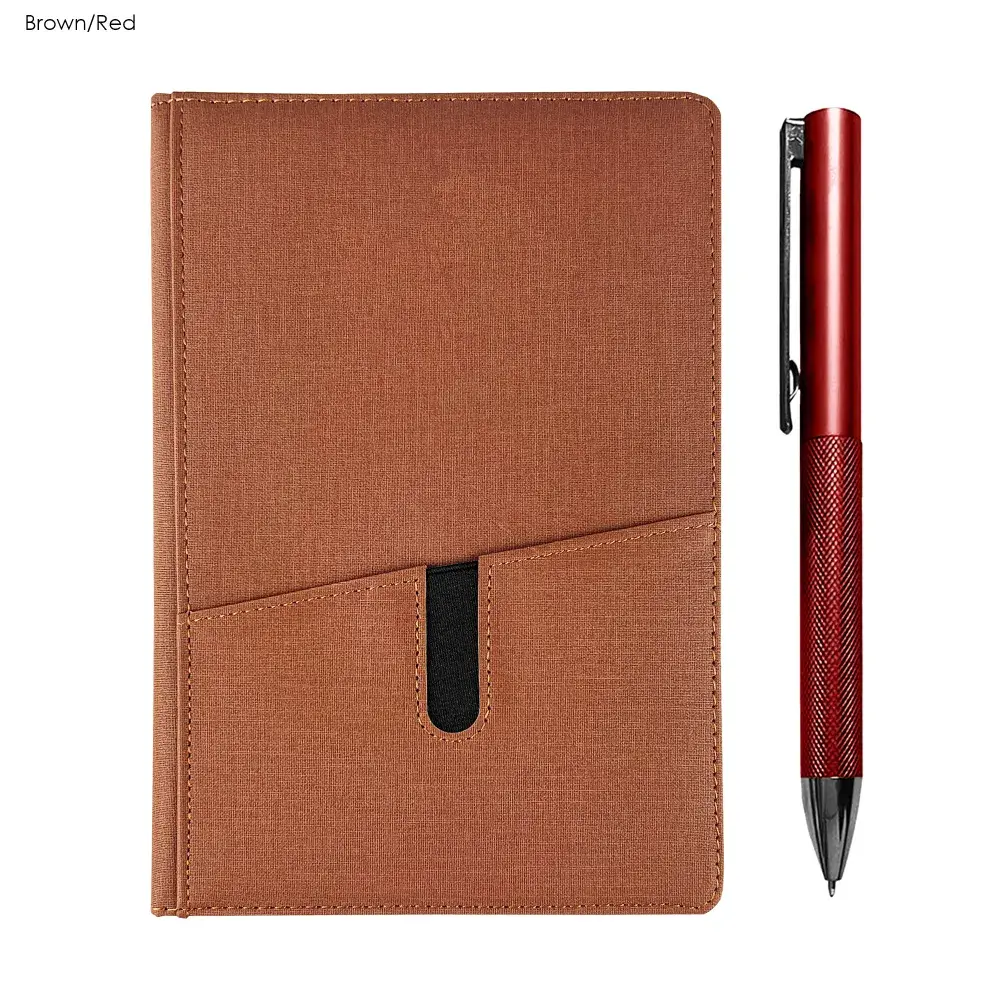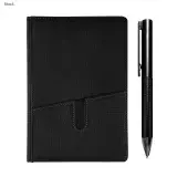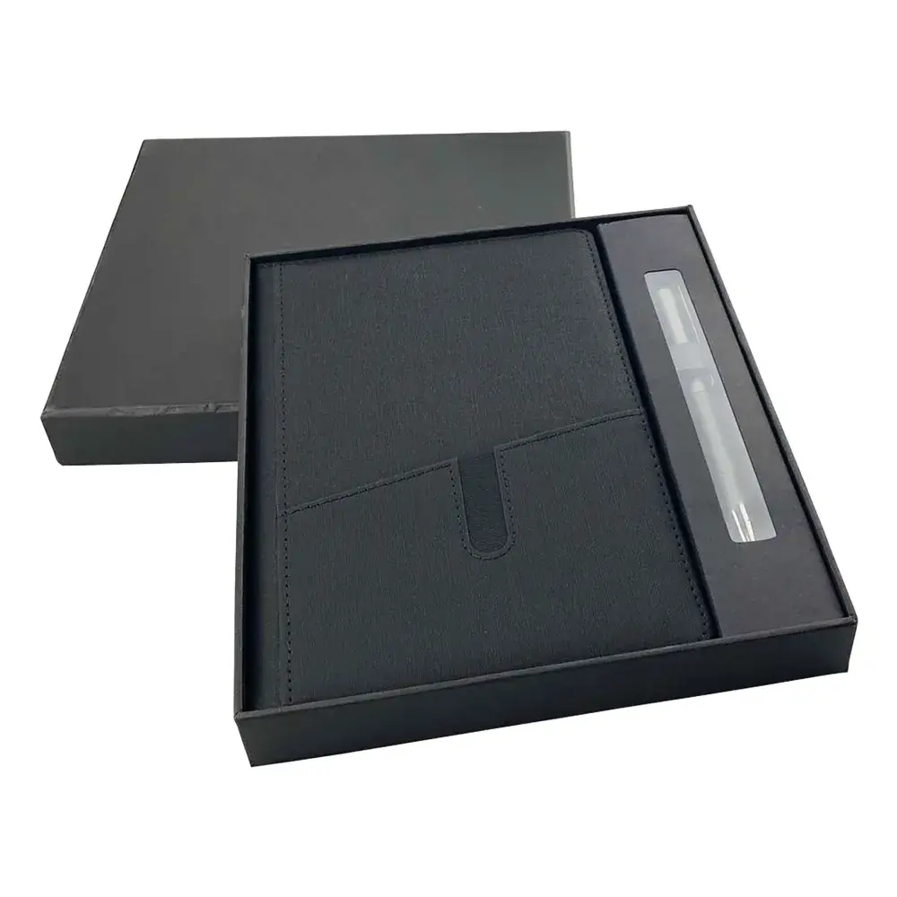 The stylish A5 Isaly Notebook features a high quality cotton style hard PU cover with a front pocket and 160 pages of lined paper. Paired with a sleek metal pen with a Parker Type German refill, both are presented in a durable black cardboard gift box, perfect for corporate gifting.