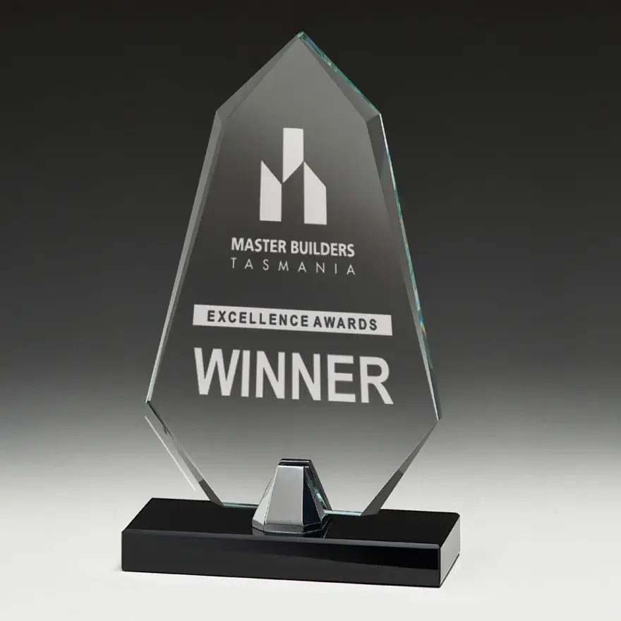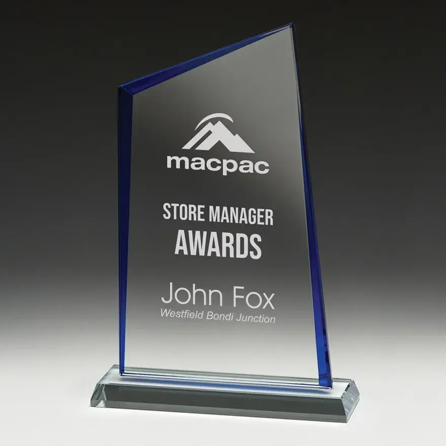 Affordable glass trophies, the Mistral series features a sweeping design that evokes the natural elements. Space for your engraving or custom logo.