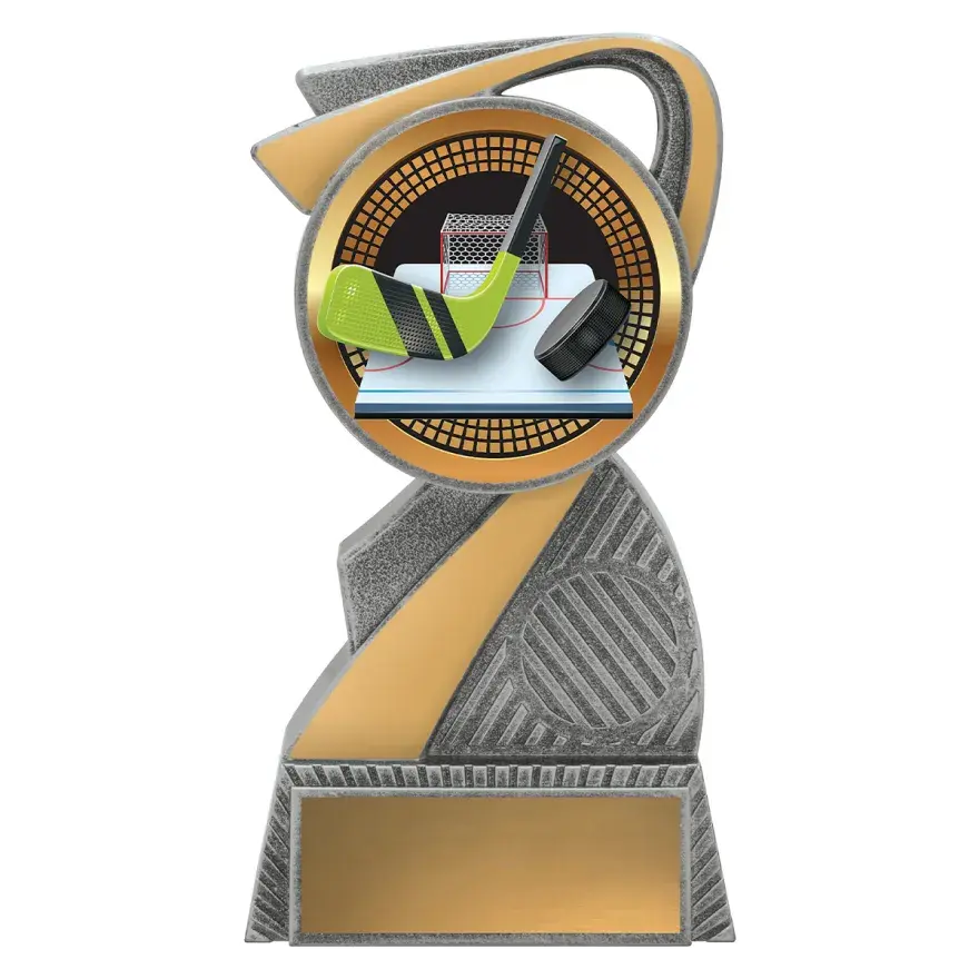 Hockey budget trophy series in antique silver and gold, a popular choice for clubs and teams. Hockey trophies feature an effective design with prominent field hockey elements. A generic theme award with the option for customisation.