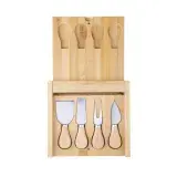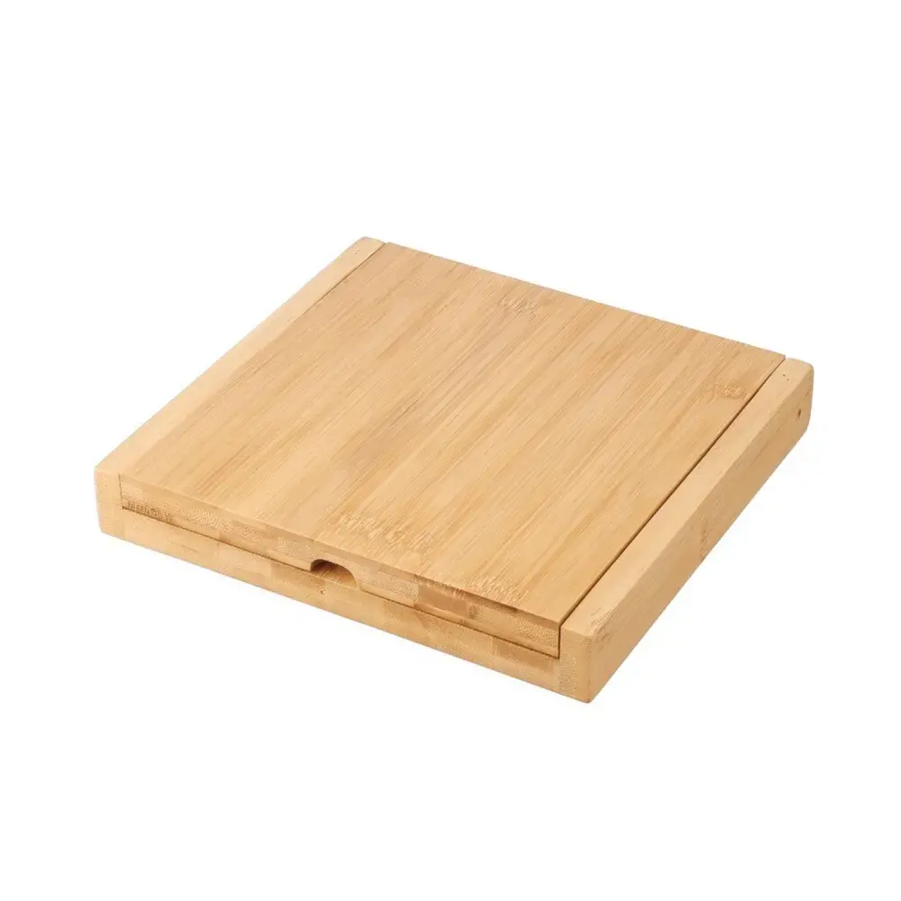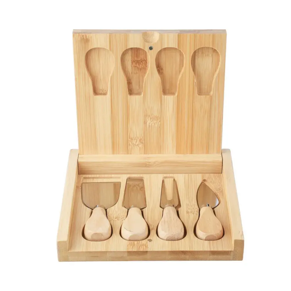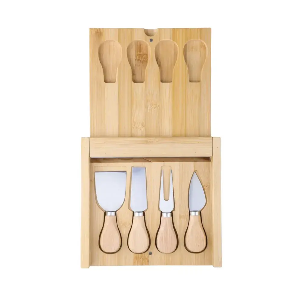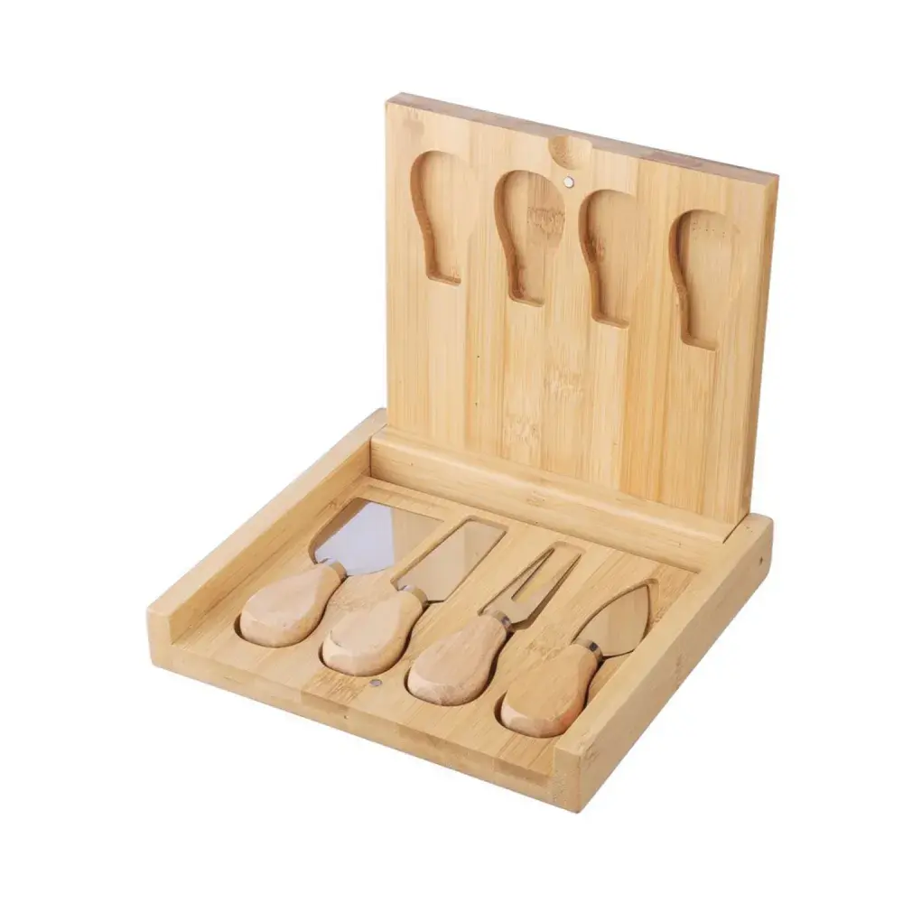 Foldable bamboo cheese board with smooth serving surface | Includes 4 stainless steel cheese tools (knife, fork, chisel, and spreader) | Hidden storage compartment for neat organization | Eco-friendly bamboo construction | Compact, durable, and portable design | Packaged in a recyclable brown cardboard box | Perfect for home entertaining, gifting, or corporate promotions