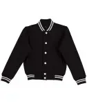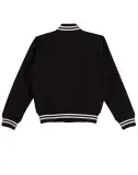 Description: Heavy ribbed collar, cuffs & waist band with contrast strips. Two front welt pockets. Press studs front closure.