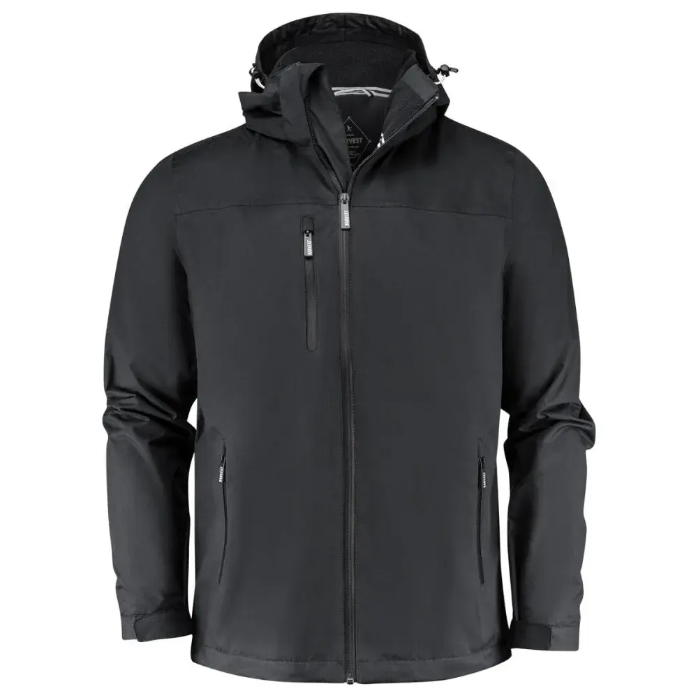 Men's functional wind and waterproof jacket with taped seams and waterproof zippers. Detachable hood, adjustable drawstring at bottom hem and hood, as well as Velcro adjustable cuffs. Outside chest pocket and inside chest pocket. Zipper opening at back and hood lining for ease of decoration.