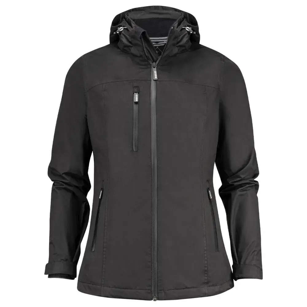 Ladies' functional wind and waterproof jacket with taped seams and waterproof zippers. Detachable hood, adjustable drawstring at bottom hem and hood, as well as Velcro adjustable cuffs. Outside chest pocket and inside chest pocket. Zipper opening at back and hood lining for ease of decoration.